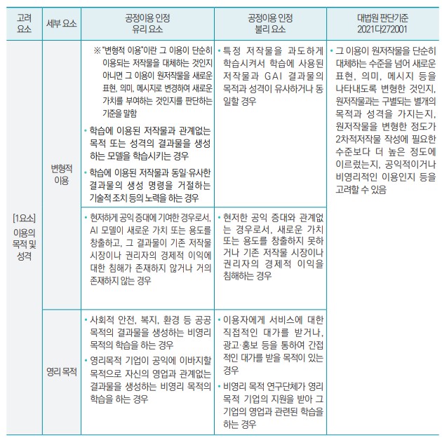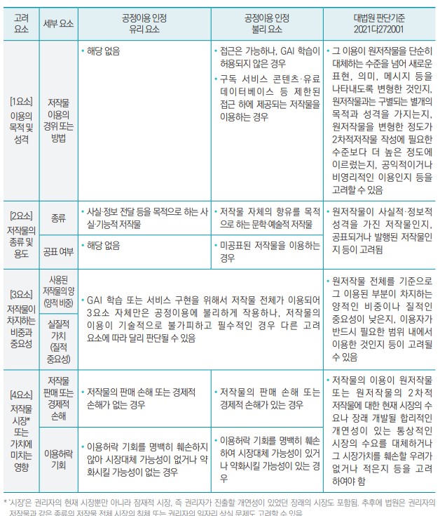 안내서는 생성형 인공지능 학습 맥락에서 공정이용 판단 시 고려되는 네 가지 요소를 설명하였다. 공정이용 해당 여부는 미국에서도 법원마다 다른 판단이 나오는 등 법률 전문가도 명확하게 설명하기 어려운데다가, 국내는 물론 해외에서도 AI 학습데이터에 대해 최종 판결을 전혀 찾아볼 수 없는 시점이다. 그럼에도 불구하고 AI 데이터 학습에서 공정이용에 유리한 요소와 불리한 요소를 가급적 구체적으로 구분해보고자 노력했다. 상업적 목적이나 웹 크롤링 방식의 인공지능 학습이 공정이용에서 배제되는 것은 아니며, 특정 요소에서 불리하게 평가되더라도 종합적으로 판단하여 공정이용에 해당할 수도 있다는 점을 분명하게 확인했다.